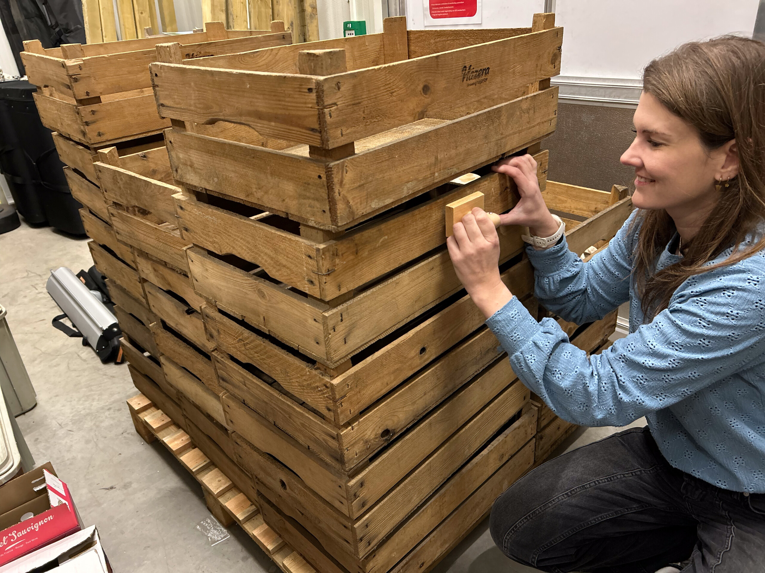 I end the day on a creative note: stamping our vegetable display crates with the Hazera logo.
