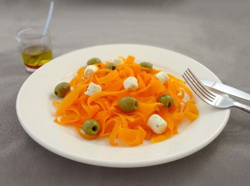 Marchewkowe tagliatelle z oliwkami i chudym twarożkiem czosnkowo-ziołowym brzmi może egzotycznie, ale samo danie jest szybkie i proste w przygotowaniu. A na koniec marchewkowa bawarka według Emi Mitobe. Smacznego!